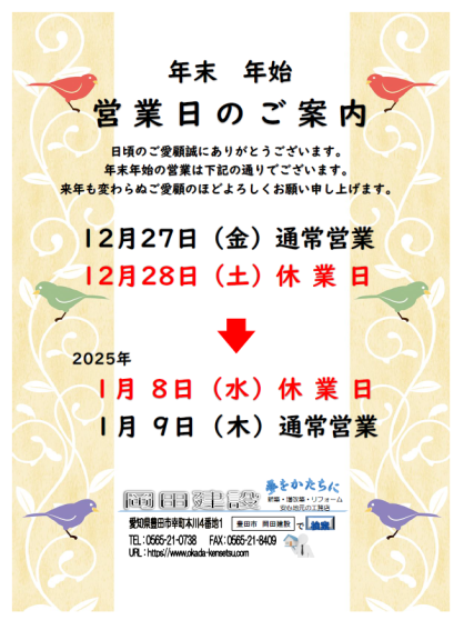 年末年始休業中のお問合せは、 営業再開後にご連絡させていただく場合もございます。