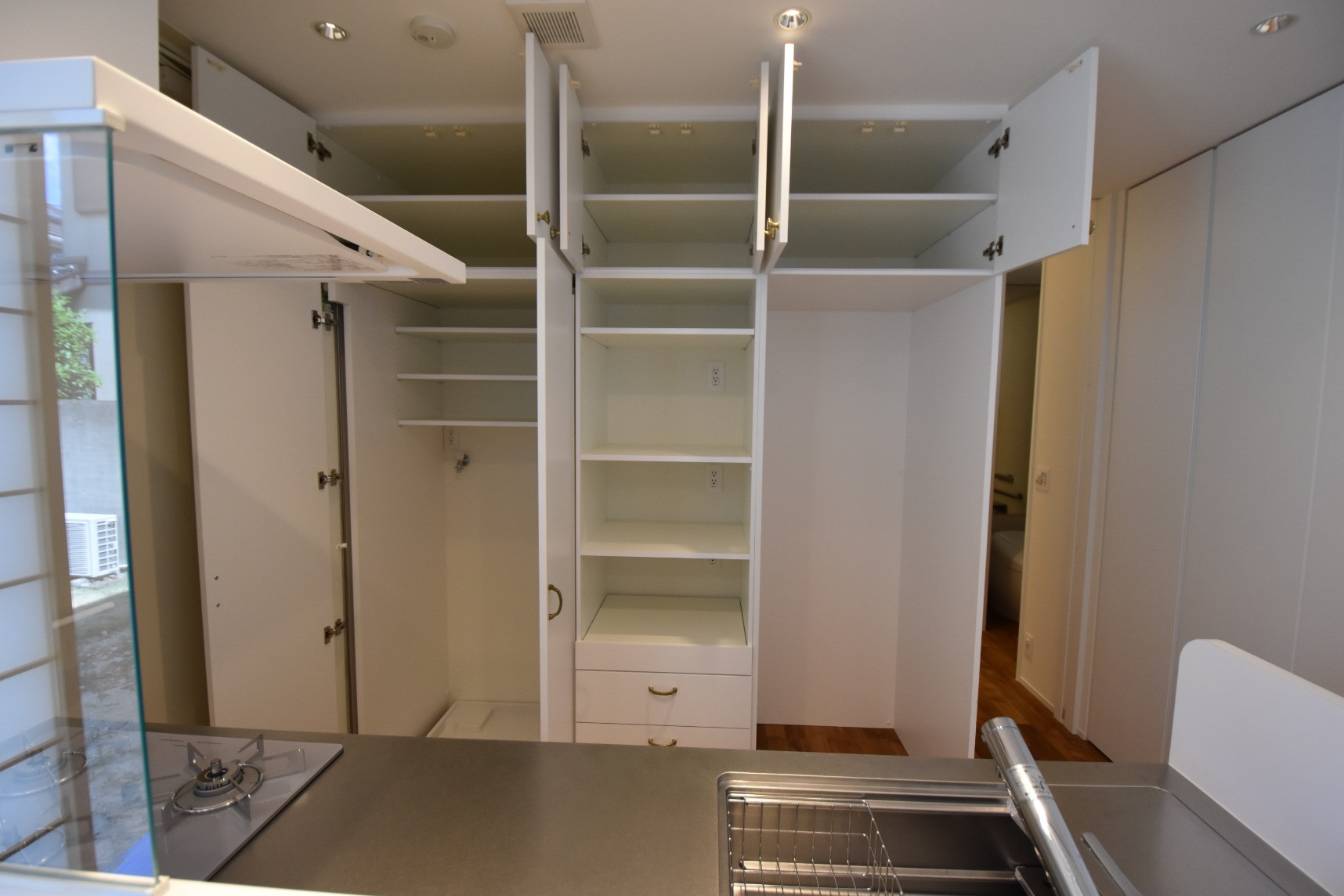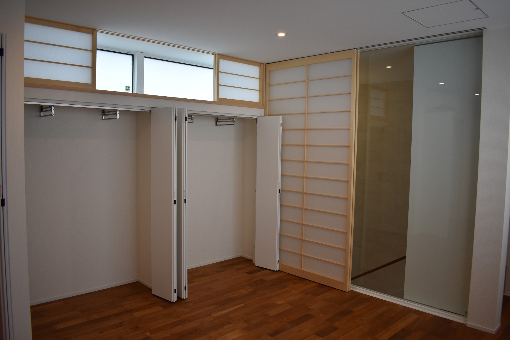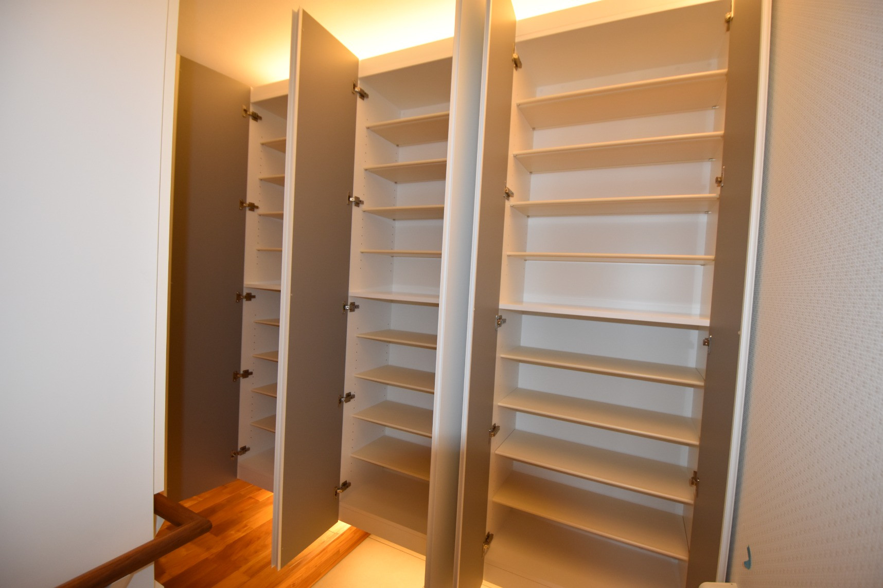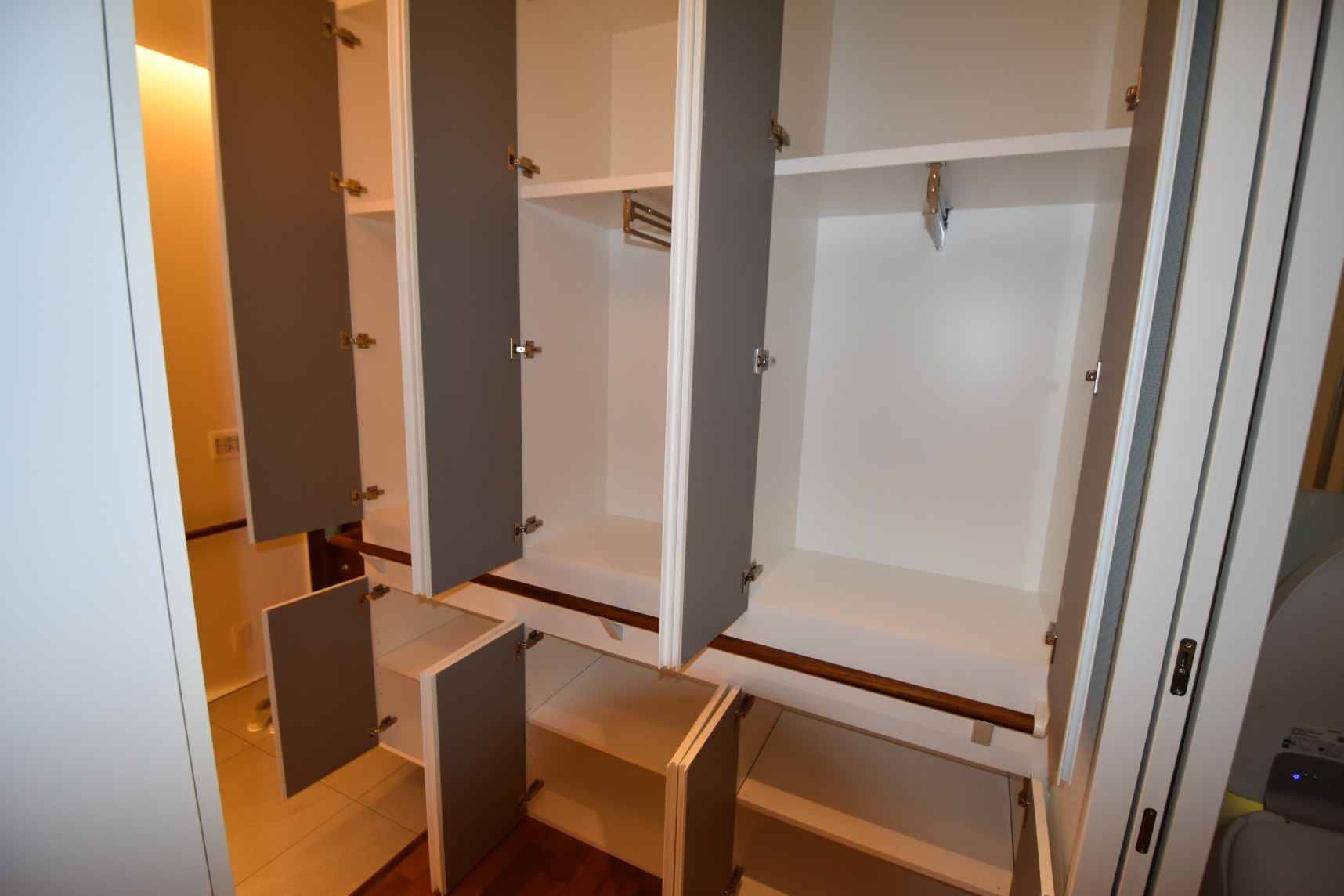 収納は各部屋にたっぷりと設け、日用品から衣類まですっきり収まるよう工夫しました。