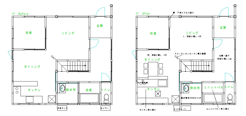 | 概要 | 給湯器の交換、 浴室リフォーム(ユニットバス、手すり、段差、窓)、 対面キッチンリフォーム(コンロ、換気扇、水栓)、 床の張替え、給湯器交換、和室・2Fクロス張替え |